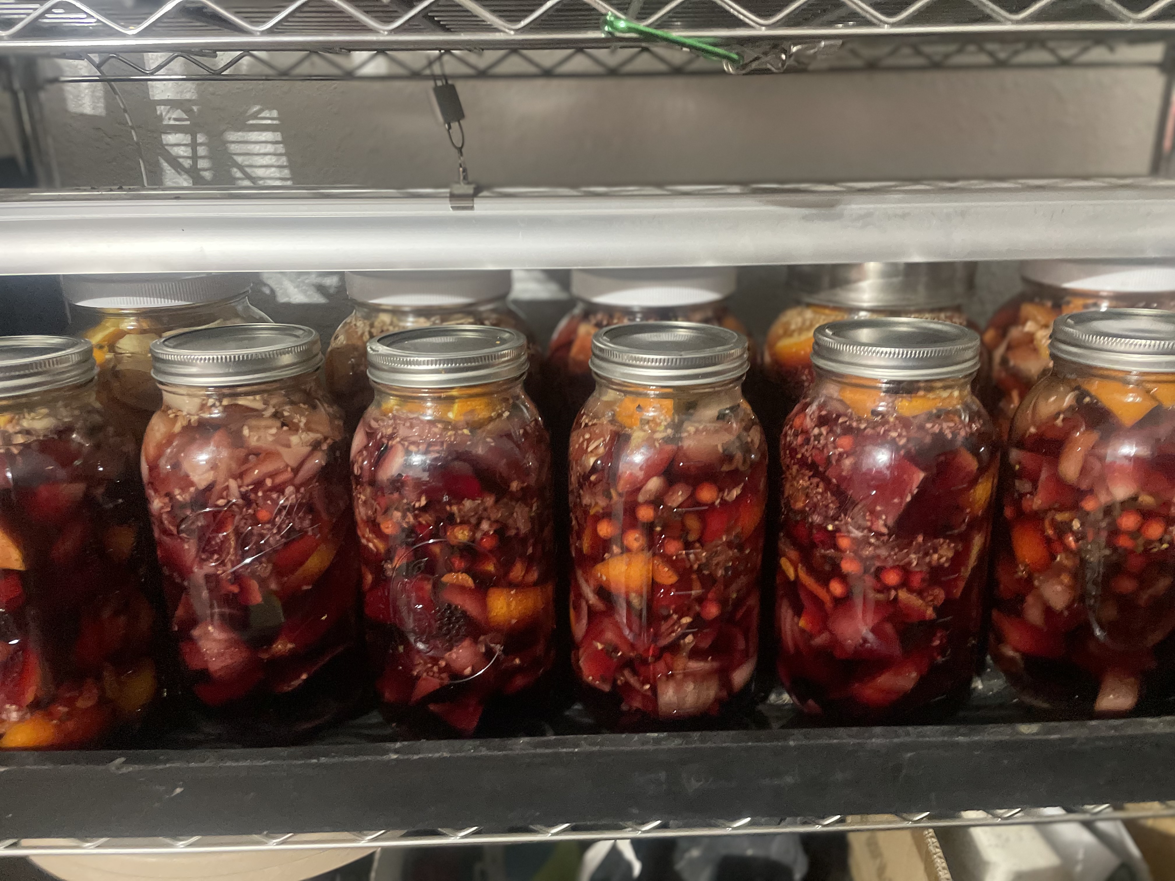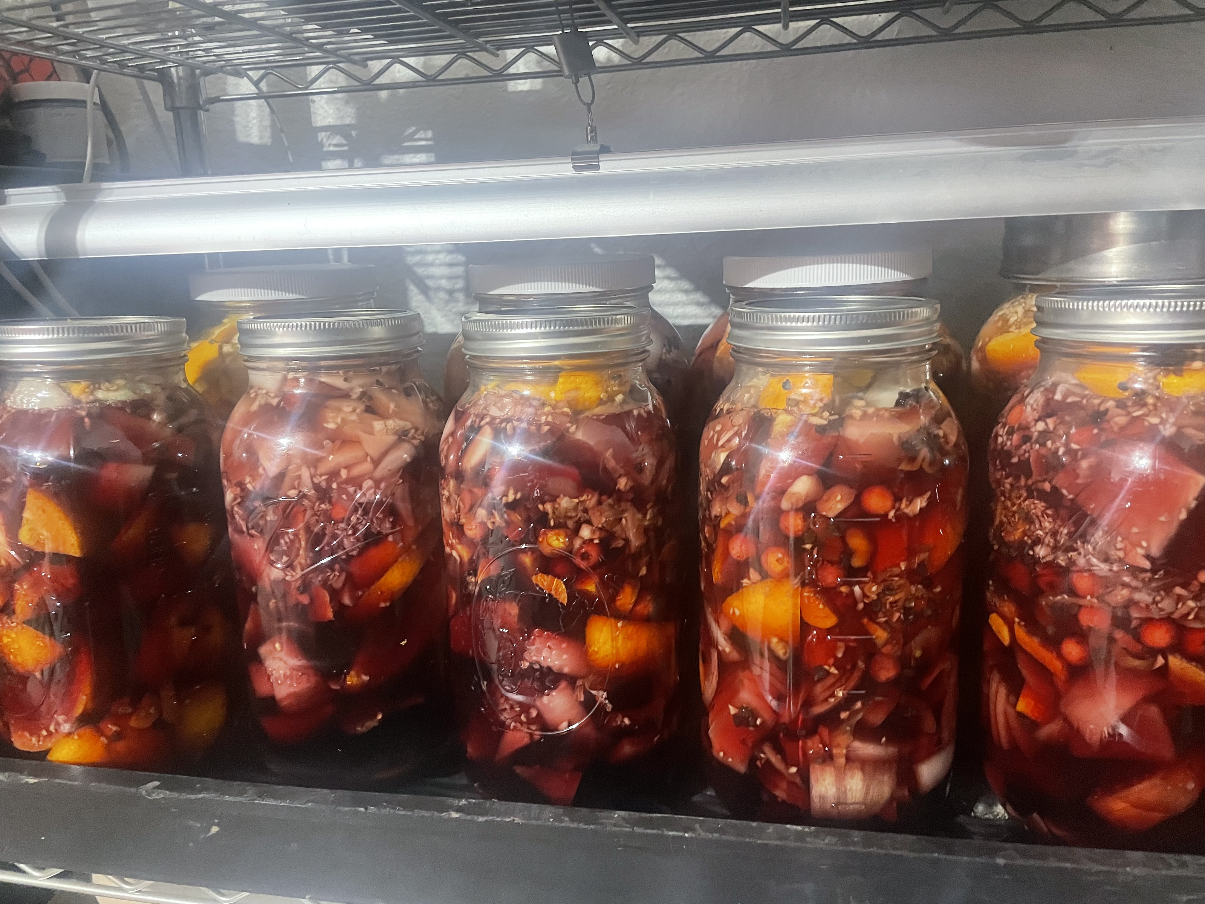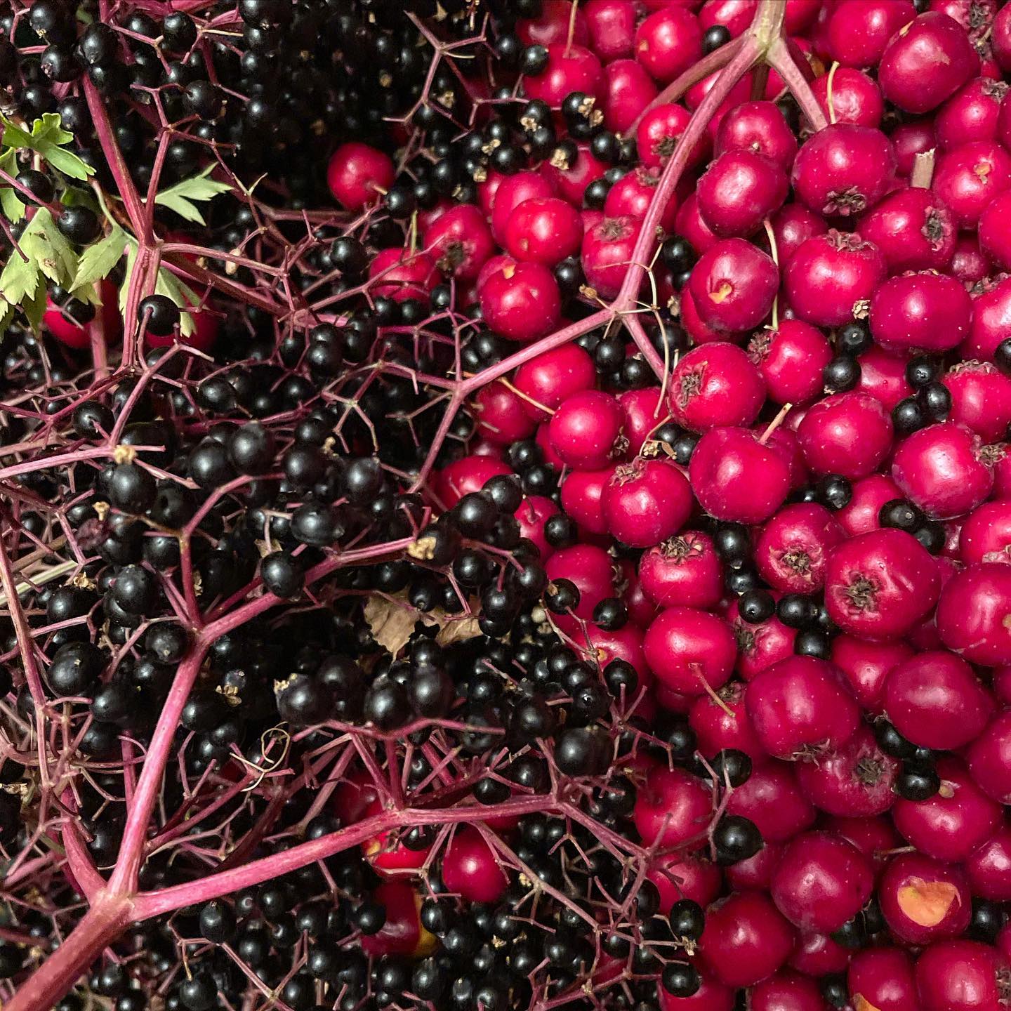 I picked hawthorn berries and elderberries near my home and put them into the fire cider with other store bought ingredients, and made in my back yard. The fruits infused for a full moon cycle before bottling with pure honey.